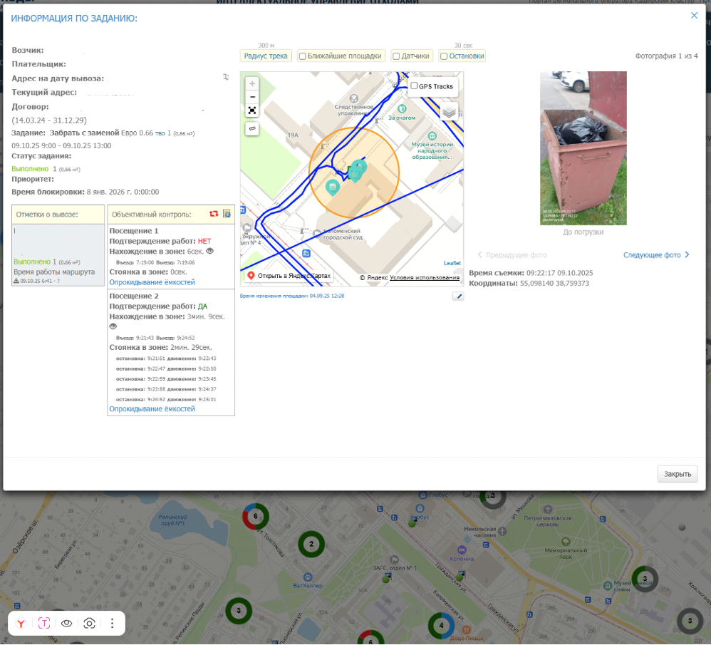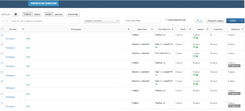 ⦁ взаимодействия с мусоровывозящими организациями для передачи им площадок, заявок на сбор и транспортировку ТКО. Контроль исполнения услуг по вывозу и размещению отходов.